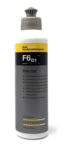 KOCH CHEMIE F6.01 Se trata del nuevo pulidor de corte medio, libre de siliconas, de última generación y con una tecnología de abrasivos de óxido de aluminio única. El tamaño de grano inteligente, asegura una rápida y completa remoción de marcas circulares de lavado y otras imperfecciones para dejar un acabado espejo. El pulidor permite prolongados tiempos de trabajo sin secarse, prácticamente sin generar polvillo. CORTE: 6 BRILLO: 7 PRESENTACIÓN: 250 ml. Somos Glare Cars Detailing