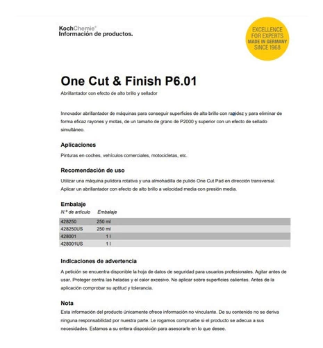 One Cut & Finish P6.01 1 LITRO Abrillantador con efecto de alto brillo y sellador Innovador abrillantador de máquinas para conseguir superficies de alto brillo con rapidez y para eliminar de forma eficaz rayones y motas, de un tamaño de grano de P2000 y superior con un efecto de sellado simultáneo. Aplicaciones Pinturas en coches, vehículos comerciales, motocicletas, etc. Recomendación de uso Utilizar una máquina pulidora rotativa y una almohadilla de pulido One Cut Pad en dirección transversal. Aplicar un abrillantador con efecto de alto brillo a velocidad media con presión media. Agitar antes de usar. Proteger contra las heladas y el calor excesivo. No aplicar sobre superficies calientes. Antes de la aplicación comprobar su aptitud y tolerancia.